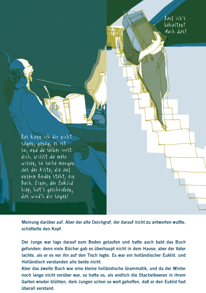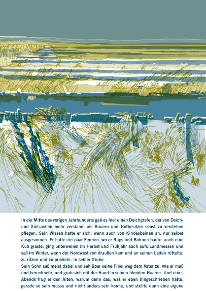 Mit schwungvollen und stimmungsvollen, teils düsteren Zeichnungen erzählt sie von Natur und Naturgewalt, von Glauben und Aberglauben, von Eitelkeit und Größenwahn. Ihre Bilder schaffen dem Drama eine bedrohliche Szene – die Katastrophe wird sichtbar. Storms Text bleibt weitgehend erhalten, allerdings gestaltet auf den drei Ebenen: Bild – Dialog – Erzählung.