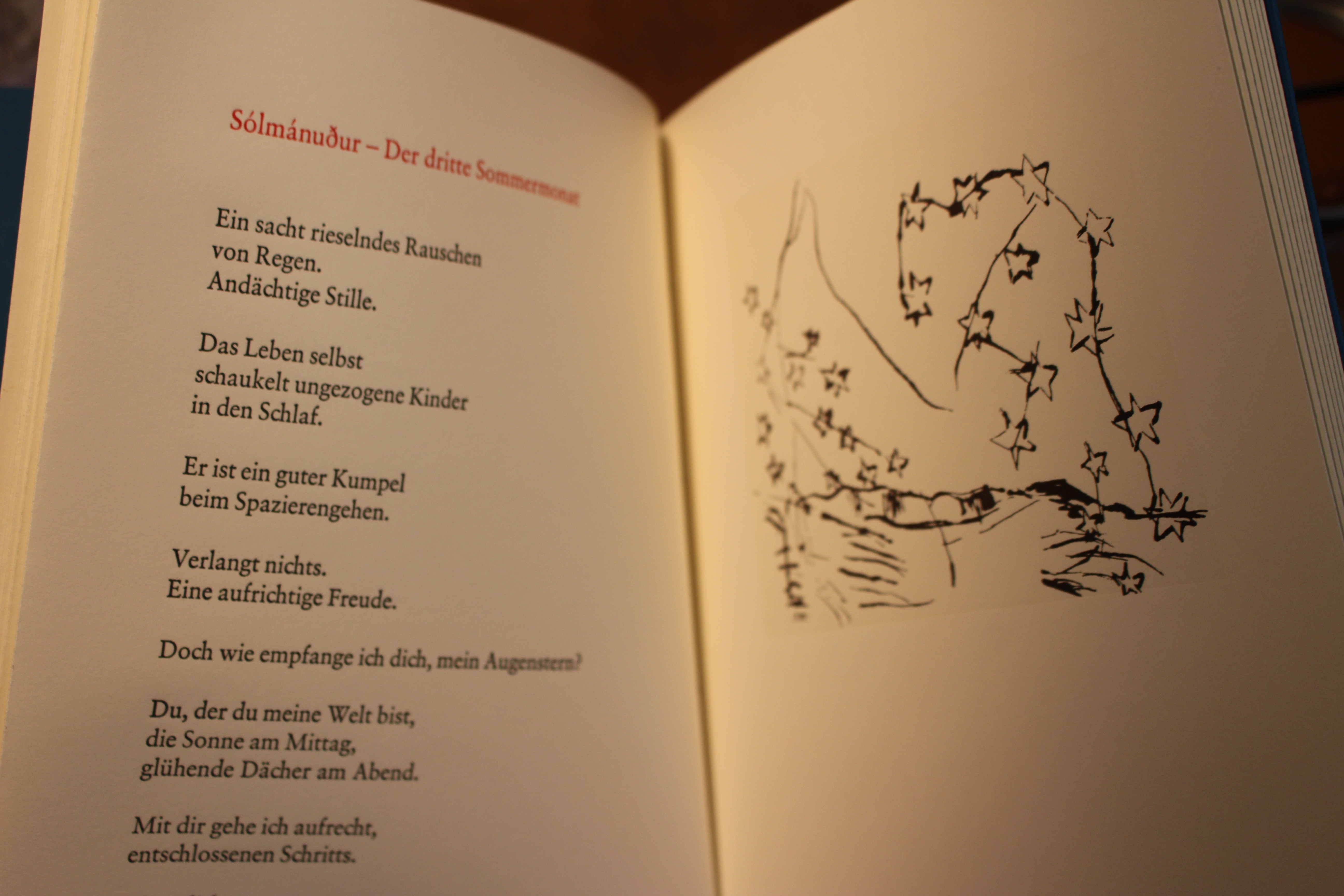 Beim Lesen wandern wir durch eine Seelenlandschaft im Einklang mit dem Jahresverlauf. Es sind Gedichte, die die alten isländischen Monatsnamen im Titel tragen. Übersetzt wurde das Werk von Jón Thor Gíslason und Wolfgang Schiffer.