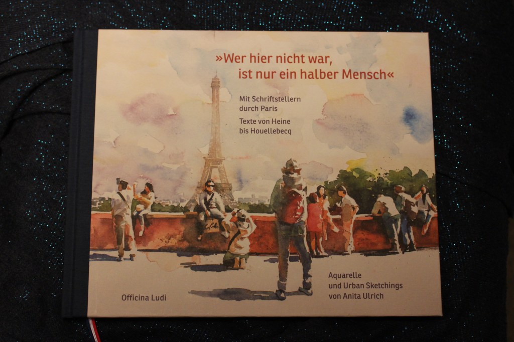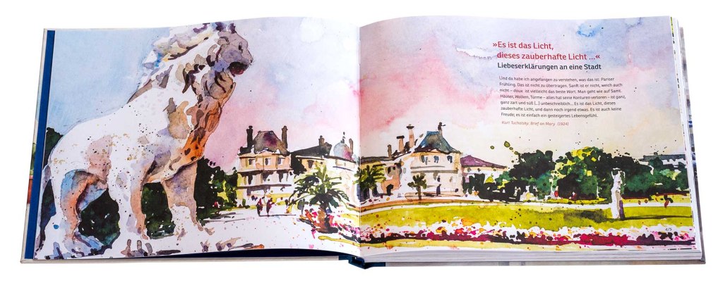 Im Vordergrund stehen die Aquarelle und Urban Sketchings von Anita Ulrich. Die Bilder fangen Lebensmomente in der ganzen Stadt ein. Dabei liegt das Augenmerk nicht auf den touristischen Sehenswürdigkeiten. Diese werden gezeigt, aber bleiben, wie bereits das Titelbild belegt, im Hintergrund. Es sind Augenblicke im Alltag, voller Ruhe und Lebendigkeit. Paris lebt vom Licht und das Spiel des Lichtwechsels wird zart durch die Farben und Pinselführung eingefangen. Das Buch ist kein gewöhnlicher Bildband. Die visuelle Liebeserklärung an die Stadt wird verstärkt durch die Zitate. Eine gelungene Auswahl an Texten über die Eindrücke der Stadt. Somit ist das Buch eine kulturelle Reise mit Schriftstellern durch Paris mit Textfragmenten und Zitaten von Heine bis Houellebecq, wie es bereits im Untertitel heißt.