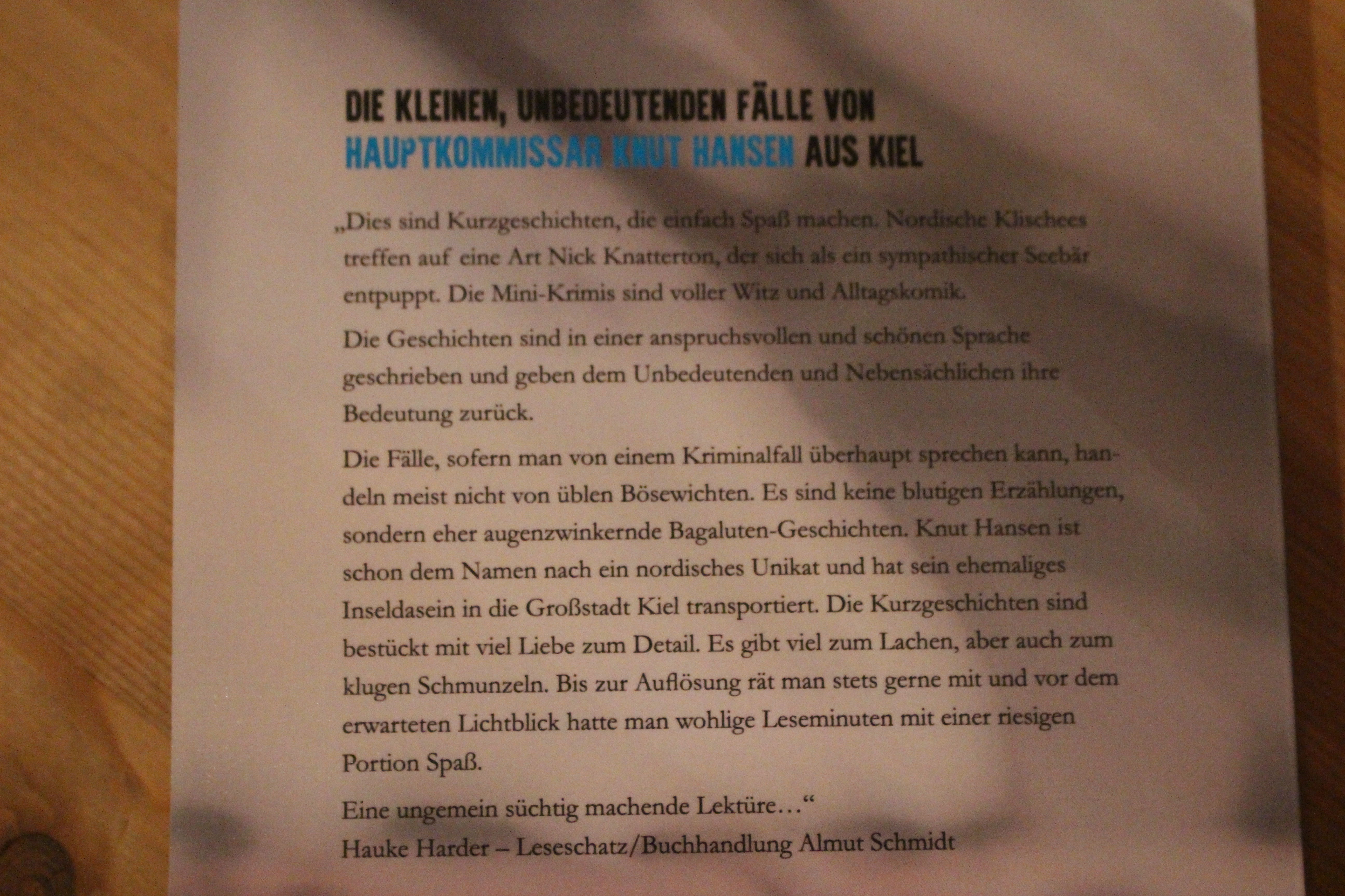 Die Fälle, sofern man von einem Kriminalfall überhaupt sprechen kann, handeln meist nicht von üblen Bösewichten. Es sind keine blutigen Erzählungen, sondern eher augenzwinkernde Bagaluten-Geschichten. Knut Hansen ist schon dem Namen nach ein nordisches Unikat und hat sein ehemaliges Inseldasein in die Großstadt Kiel transportiert. Die Kurzgeschichten sind bestückt mit viel Liebe zum Detail. Es gibt viel zum Lachen, aber auch zum klugen Schmunzeln. Bis zur Auflösung rät man stets gerne mit und vor dem erwarteten Lichtblick hatte man wohlige Leseminuten mit einer riesigen Portion Spaß.