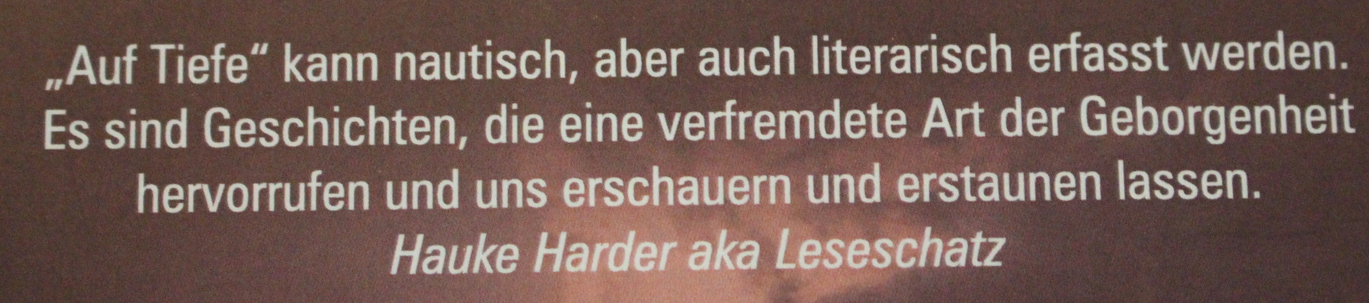 „Auf Tiefe“ kann mit diesen Erzählungen nautisch aber auch literarisch erfasst werden. Es sind von Salzwasser getränkte Geschichten, die das Meer als Metapher in seiner ganzen Facette einfangen. Die ruhige und glatte See kann innerhalb eines Augenblicks aufbrausen und bedrohlich sein. So wandelbar sind die Charaktere und ihre Erzählungen in dieser Anthologie. Alle eint die Liebe oder die Abhängigkeit zum und vom Meer. Ein historischer und moderner Blick auf Küstenmenschen, die Trauriges, Wahres und auch sehr Unheimliches zu erzählen haben. Die Küste wird zum Beispiel Zeuge von Mord, von unheimlichen Erscheinungen, von einer wahren Flucht aus der DDR, vom Bootsbau und dem kapitalistischen Wandel und von einem, der seinen Glauben verlor. Es sind Geschichten, die eine verfremdete Art der Geborgenheit hervorrufen und uns zuweilen doch dabei erschauern und erstaunen lassen. Morbides sowie Gruseliges und Mythenumranktes treffen auf Schönes und offenbaren die Schattierungen des menschlichen Lebens am und auf dem Meer.