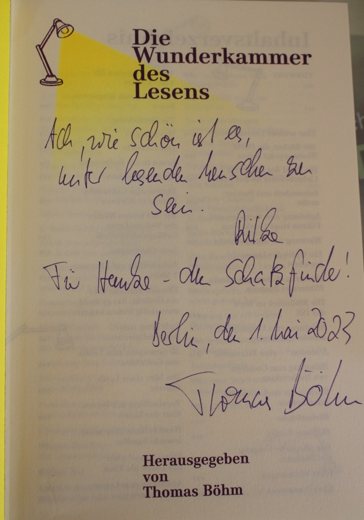 Eine wahre Wunderkammer. Die Geschichte des Lesens ist eine Geschichte des Lebens und somit ist das Buch von Thomas Böhm ein Füllhorn an Entdeckungen. Ein Leider gibt es, ein ganz kleines. Denn leider hat es der Leseschatz nicht in die Auswahl der Buchblogs geschafft, die durch den Buchblog-Award und die Originalität ihres Namens aufgefallen sind. Buchliebhaber sollten für so ein Buch dankbar sein. Ich bin es, denn es ist ein Buch, das mich erkennt. Es ist von Thomas Böhm herausgegeben worden, den wir persönlich kennenlernen durften und mit dem wir sogar zusammen vor der Kamera standen. Danke auch für die wunderbare persönliche Widmung im Buch. Das Wunderhorn des Lesens ist für länger mein Vademecum geworden.