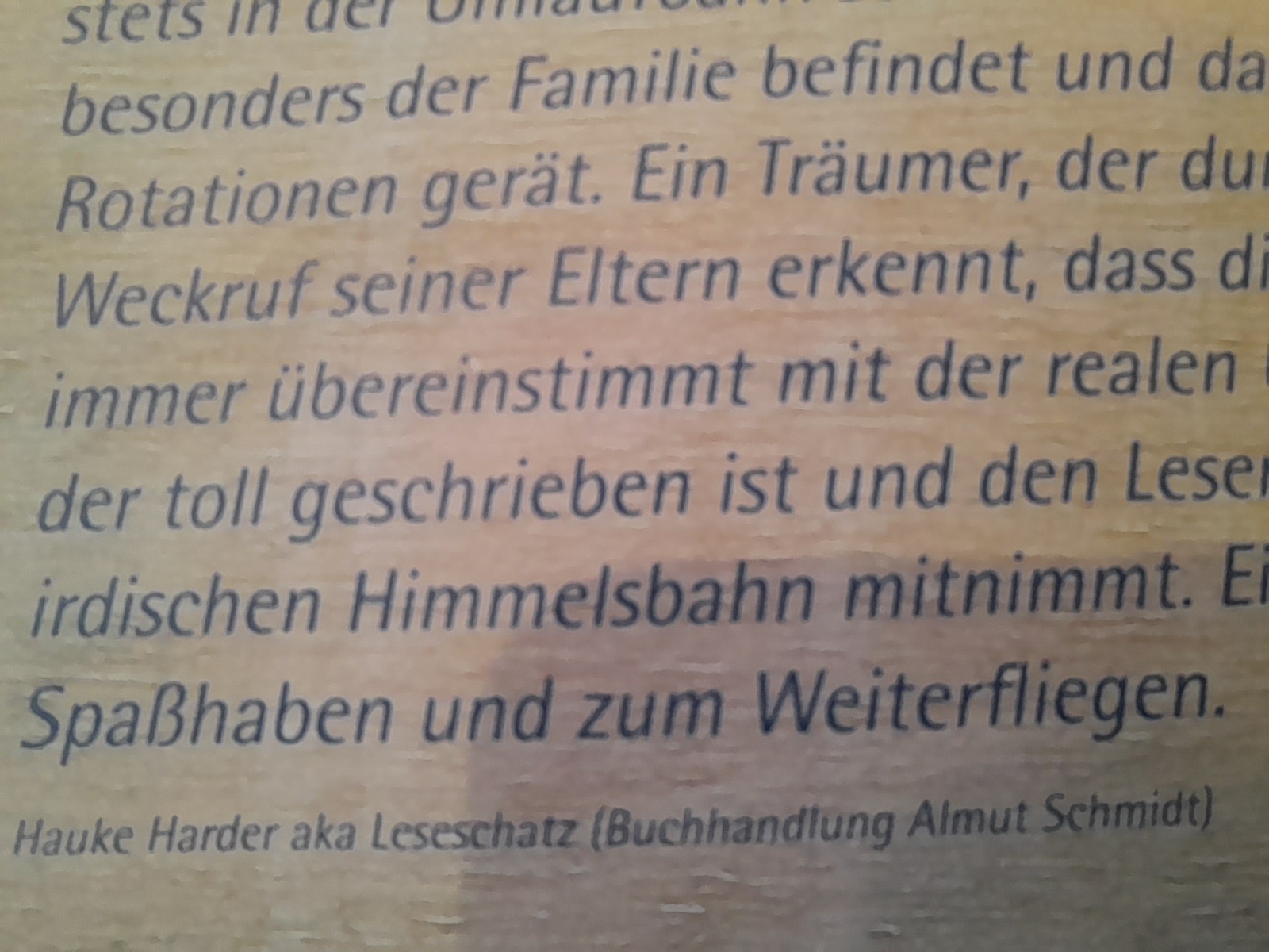 Dieser Roman ist wahrlich ein Trabant, der auf seiner Reise viele Themen streift. Unfassbar unterhaltsam und klug fliegt der Text durch irdische und himmlische Fragestellungen. Der Erzähler ist wie der genannte Himmelskörper, der sich stets in der Umlaufbahn seiner massereicheren Mitmenschen, besonders der Familie befindet und dadurch in unvorhersehbare Rotationen gerät. Ein Träumer, der durch den ungewollten Weckruf seiner Eltern erkennt, dass die erdachte Welt nicht immer übereinstimmt mit der realen Umgebung. Ein Roadtrip, der toll geschrieben ist und den Lesenden sofort auf seiner irdischen Himmelsbahn mitnimmt. Ein Buch zum Staunen, Spaßhaben und zum Weiterfliegen.