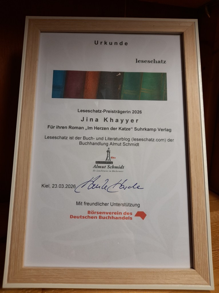 Zum zweiten Mal habe ich den Leseschatz-Preis vergeben. Ich bedanke mich bei meinen Unterstützern, dem Börsenverein des Deutschen Buchhandels, dem Literaturhaus Schleswig-Holstein und Kiels Stadtpräsidentin Bettina Aust. Der Preis ging an Jina Khayyer für ihr Buch „Im Herzen der Katze“. Die Preisverleihung fand am Montag, 23.03.2026 im Literaturhaus Schleswig-Holstein statt.
