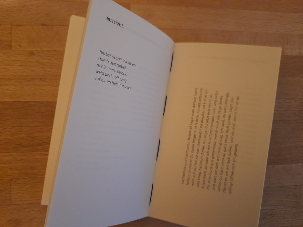 „in der stille | werden wir durstig sein“ sind Worte, die an uns, an jemanden gerichtet sind, die Trost und Hoffnung schenken. In den dunklen Nachtstunden spüren wir die Hand, die uns gereicht wird, erahnen den Vogel, der den Morgen begrüßt. Es sind Zeilen, die uns berühren, innehalten lassen und den Kopf fragen lassen, ob es verklärt ist oder einfach nur treffend und schön. Der Verstand und das Gefühl finden sich im Letzteren wieder.